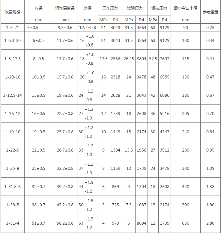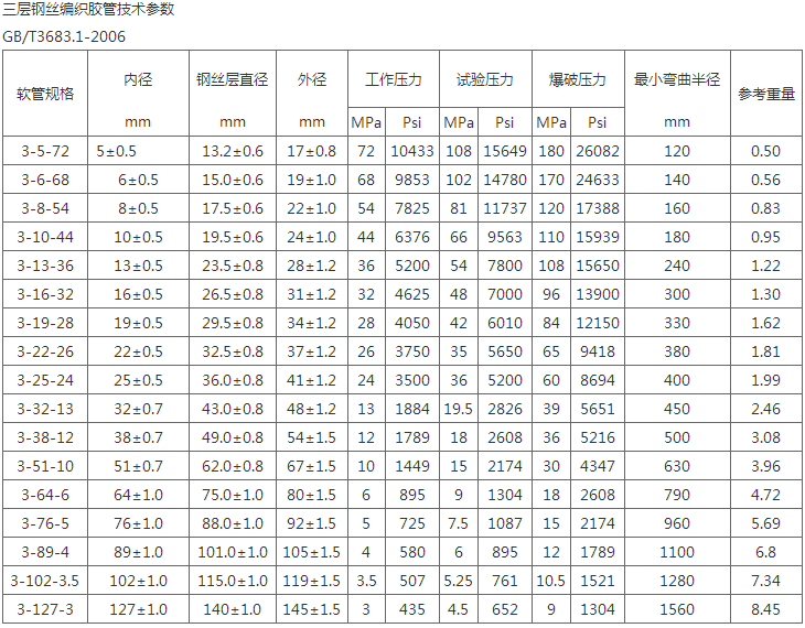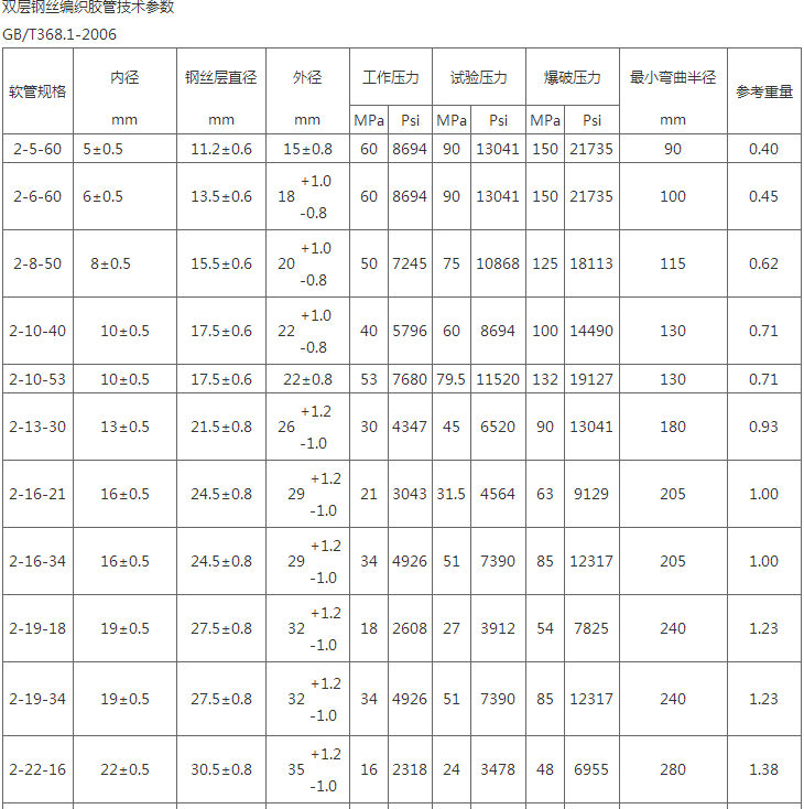 注:本企业钢丝编织胶管参照GB/T3683-1992标准设计制作,并可根据要求制作ISO/DIS1436-1985,DIN20022及SAE100RIAT,