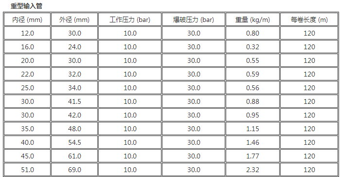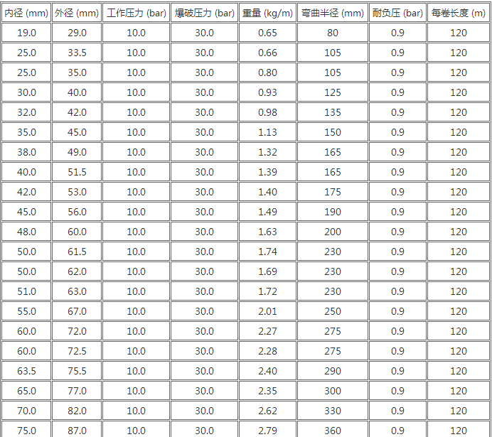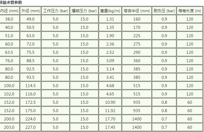 软质排水管; 适用于水、压缩空气和非腐蚀性液体的输送,广泛应用于工业、建筑业、农业等领域; 工作压力:10-15bar,18bar,20bar和25bar 温度范围:-35℃至+70℃
