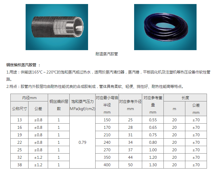 以上产品参照HG/T3036-99标准,定尺为20米。可根据要求制作大口径(φ102mm以下)和小口径(φ6mm以上)钢丝编织蒸汽胶管,高温高压胶管及φ13mm以上各规格夹布蒸汽胶管,超高温(260℃)耐腐蚀高压聚四氟乙烯软管。